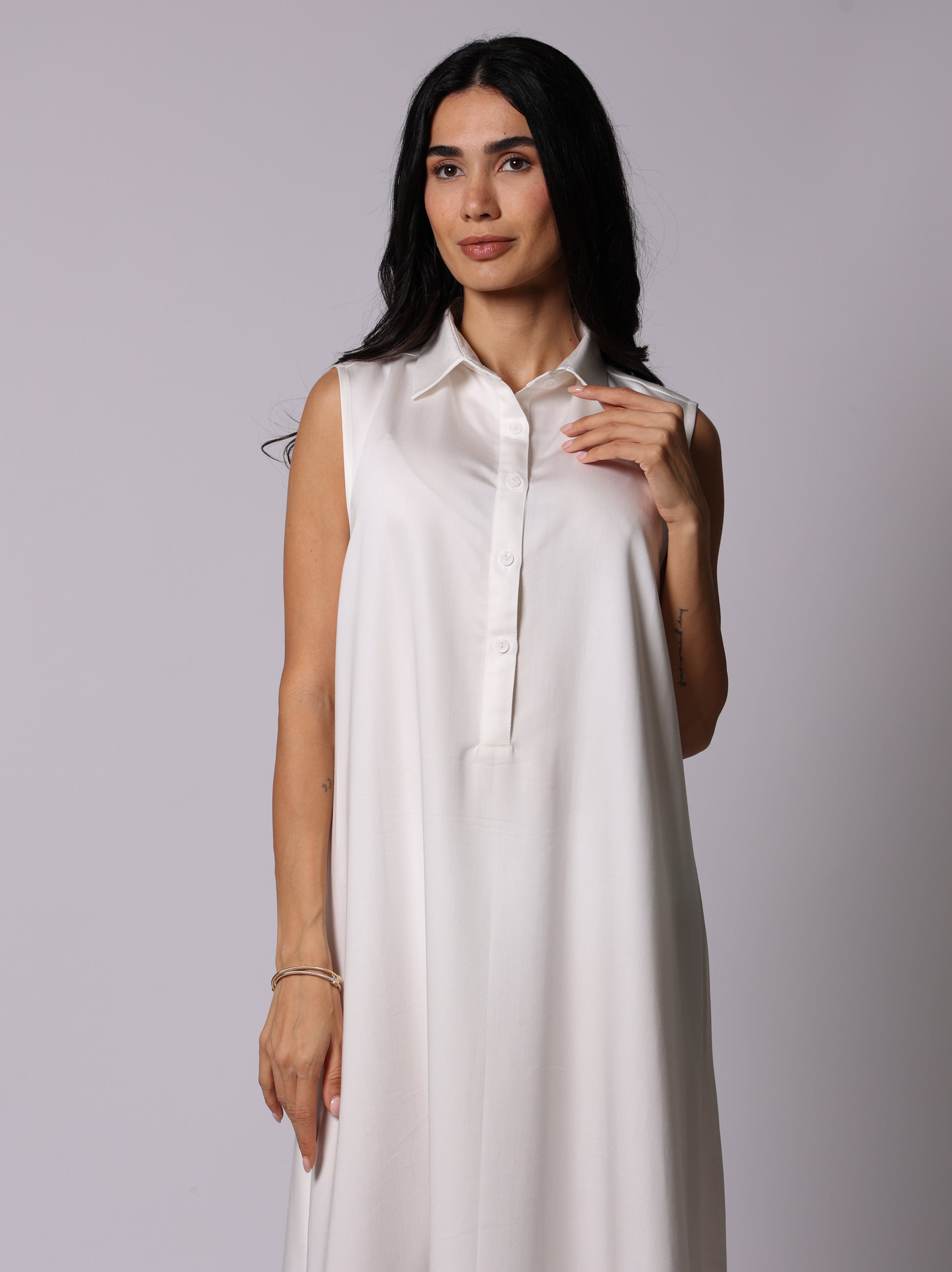 A sleeveless shirt dress crafted from a wrinkle-resistant cotton blend with a subtle satin sheen. This off-white piece features a classic shirt collar and is fully lined , Designed to be perfectly worn under an Abaya."