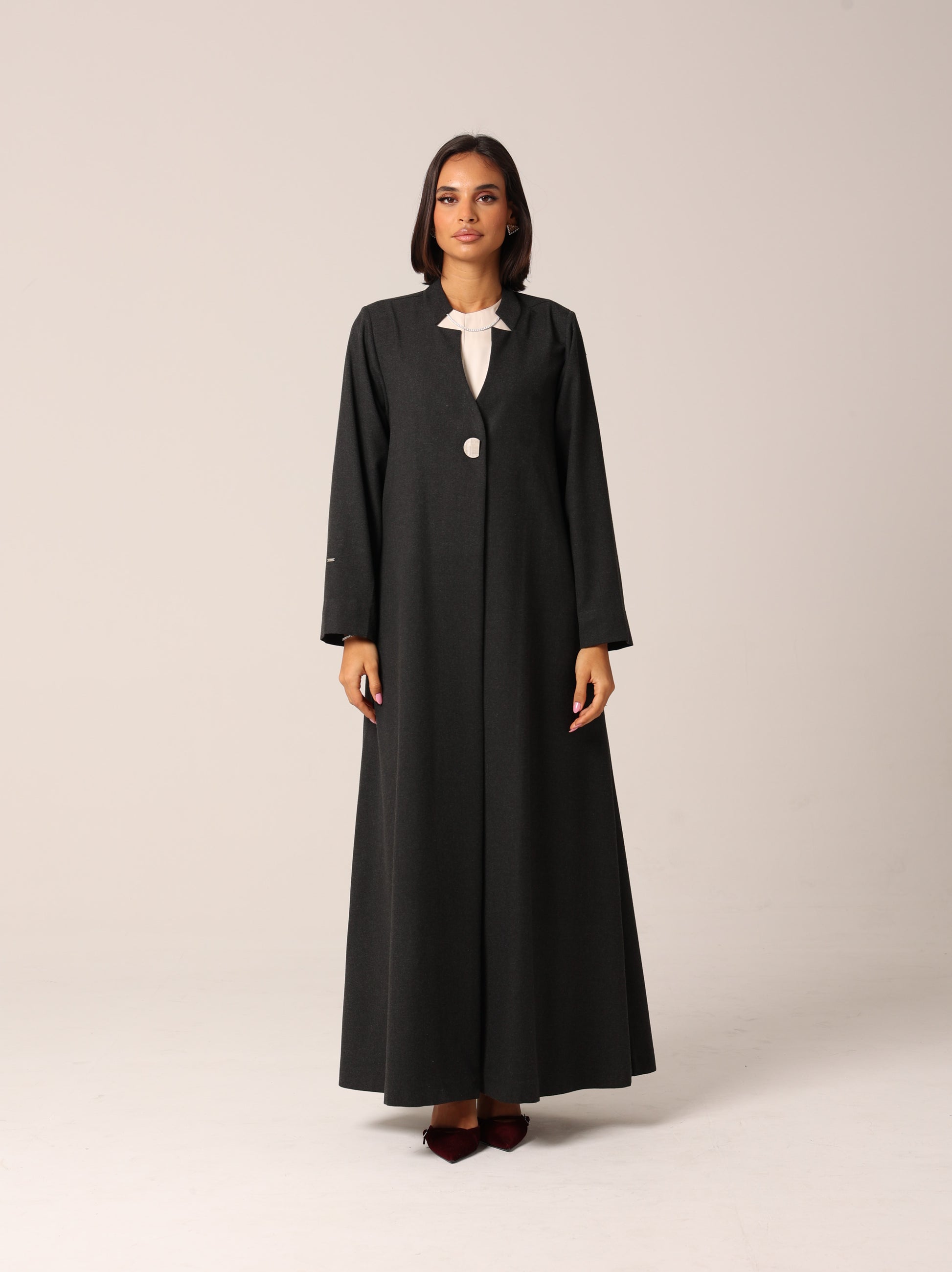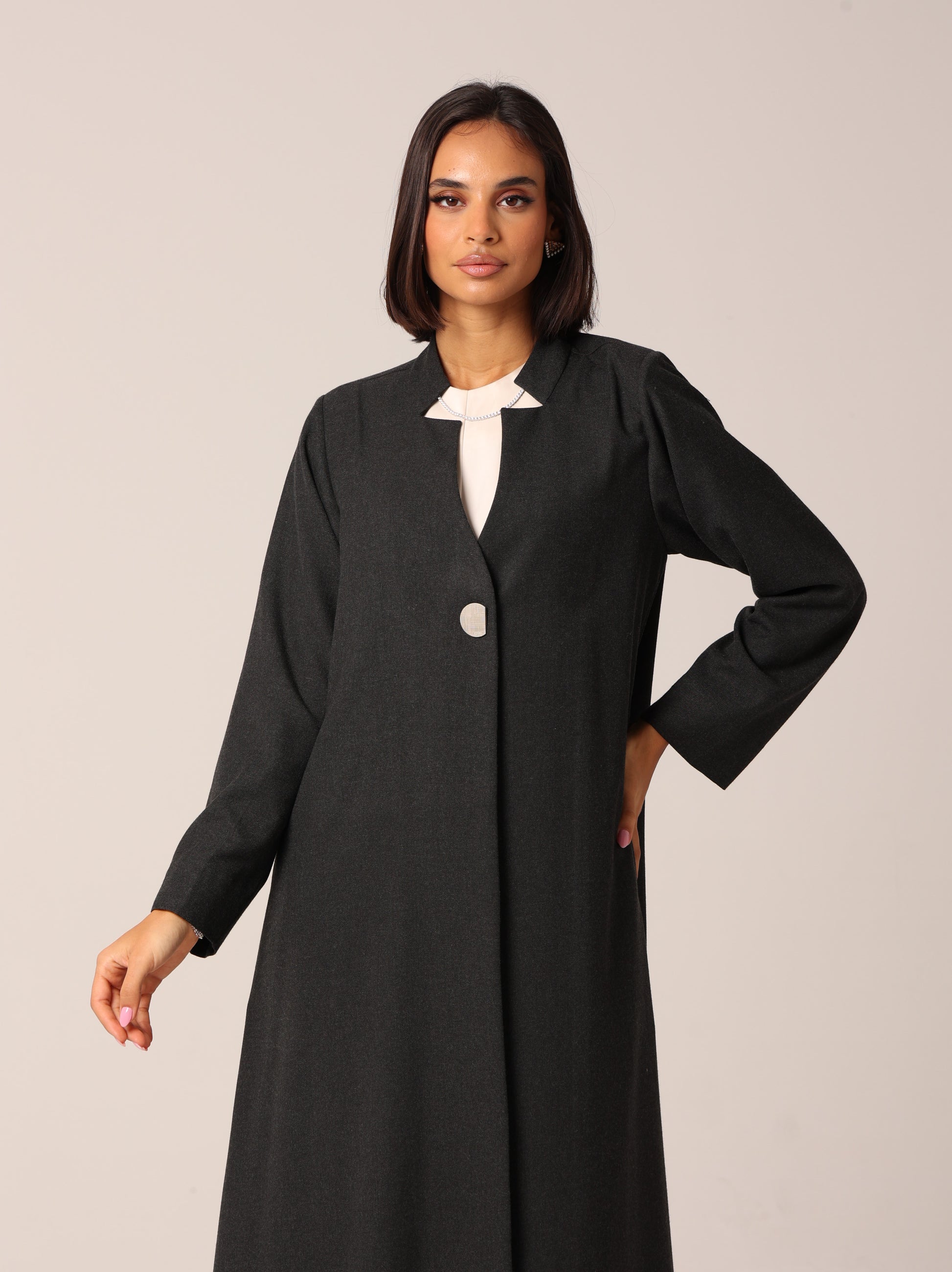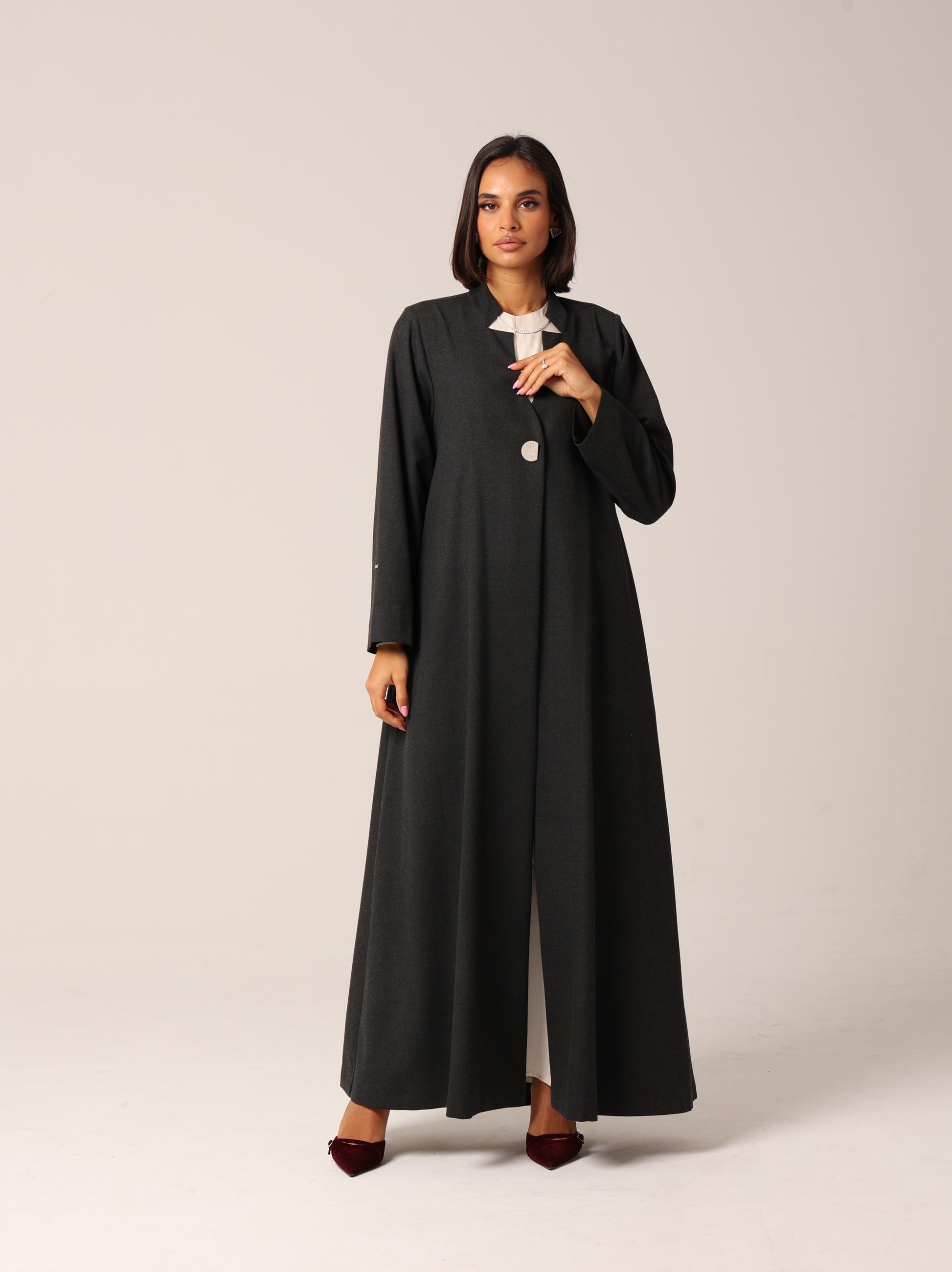 This abaya is crafted from the finest, Felt fabric, exuding a sense of opulence. It features an elegant jacket cut, fastened with a single button for a sophisticated touch."