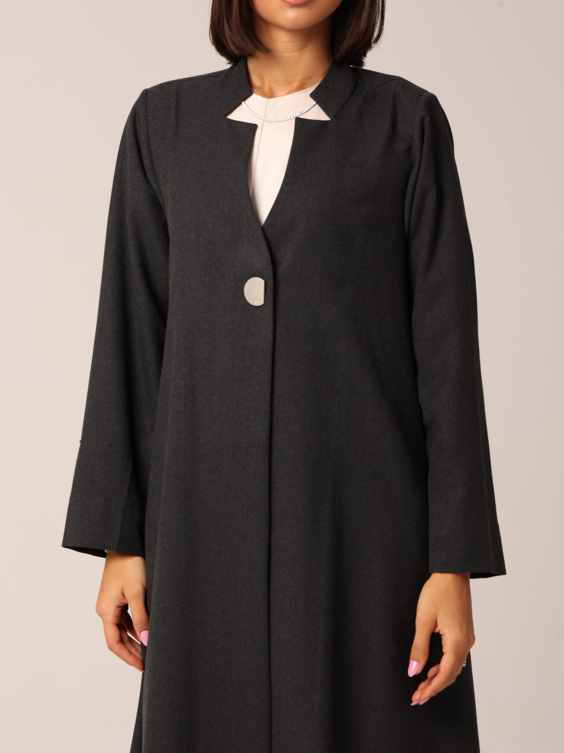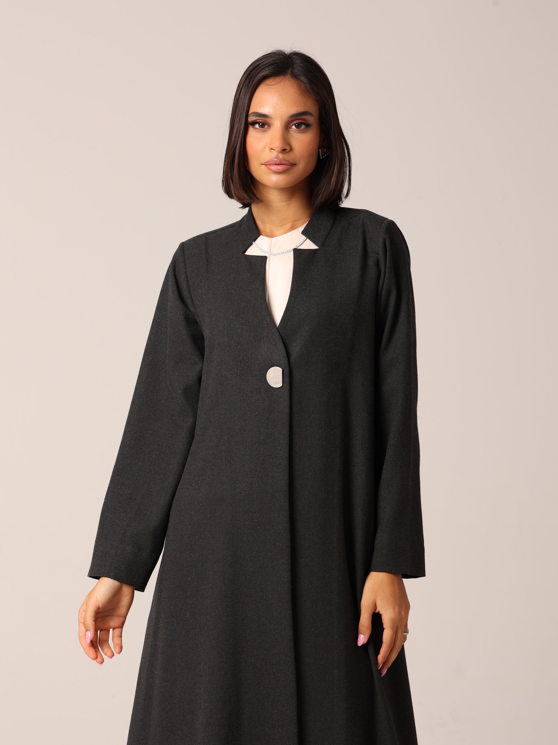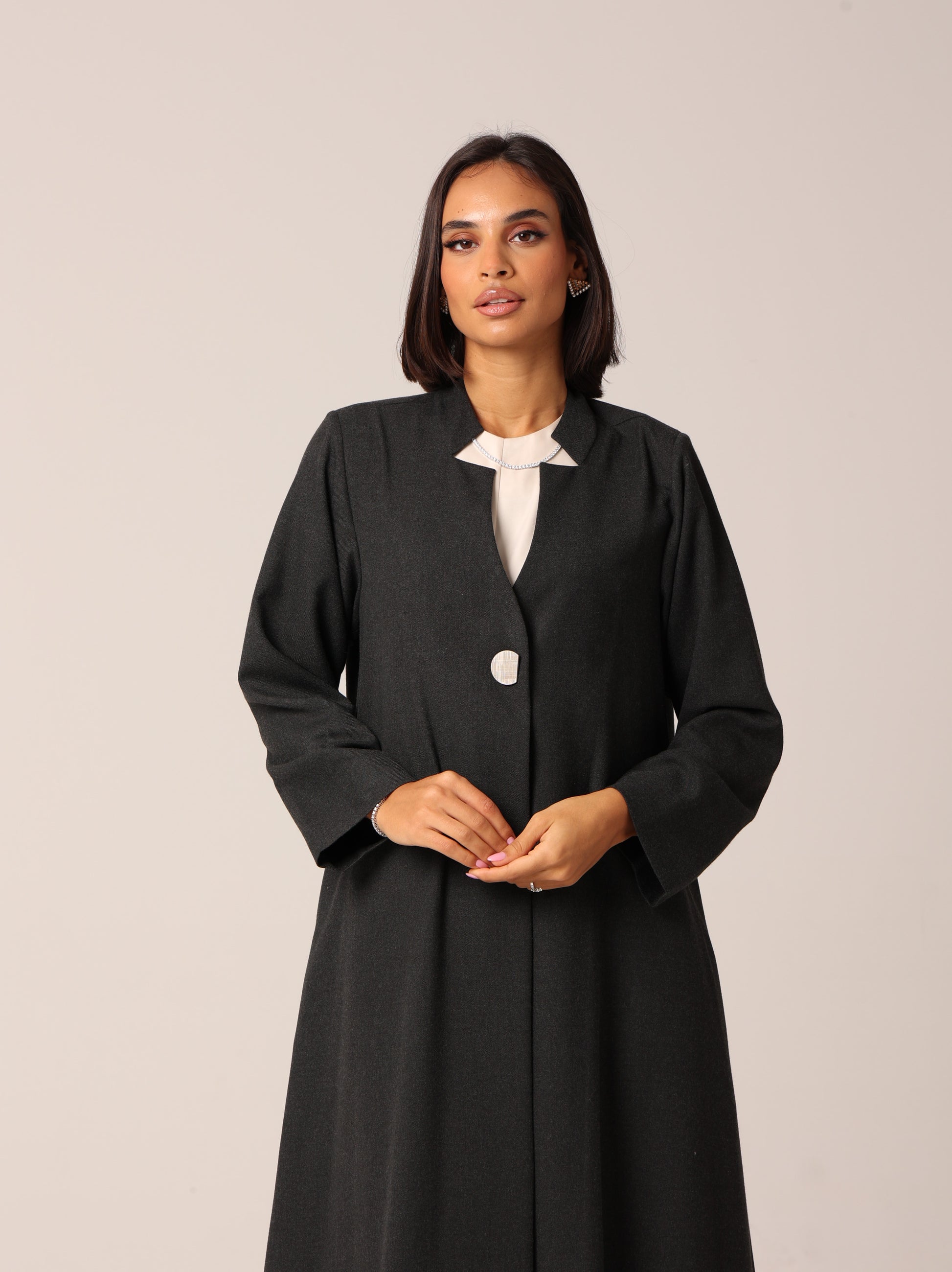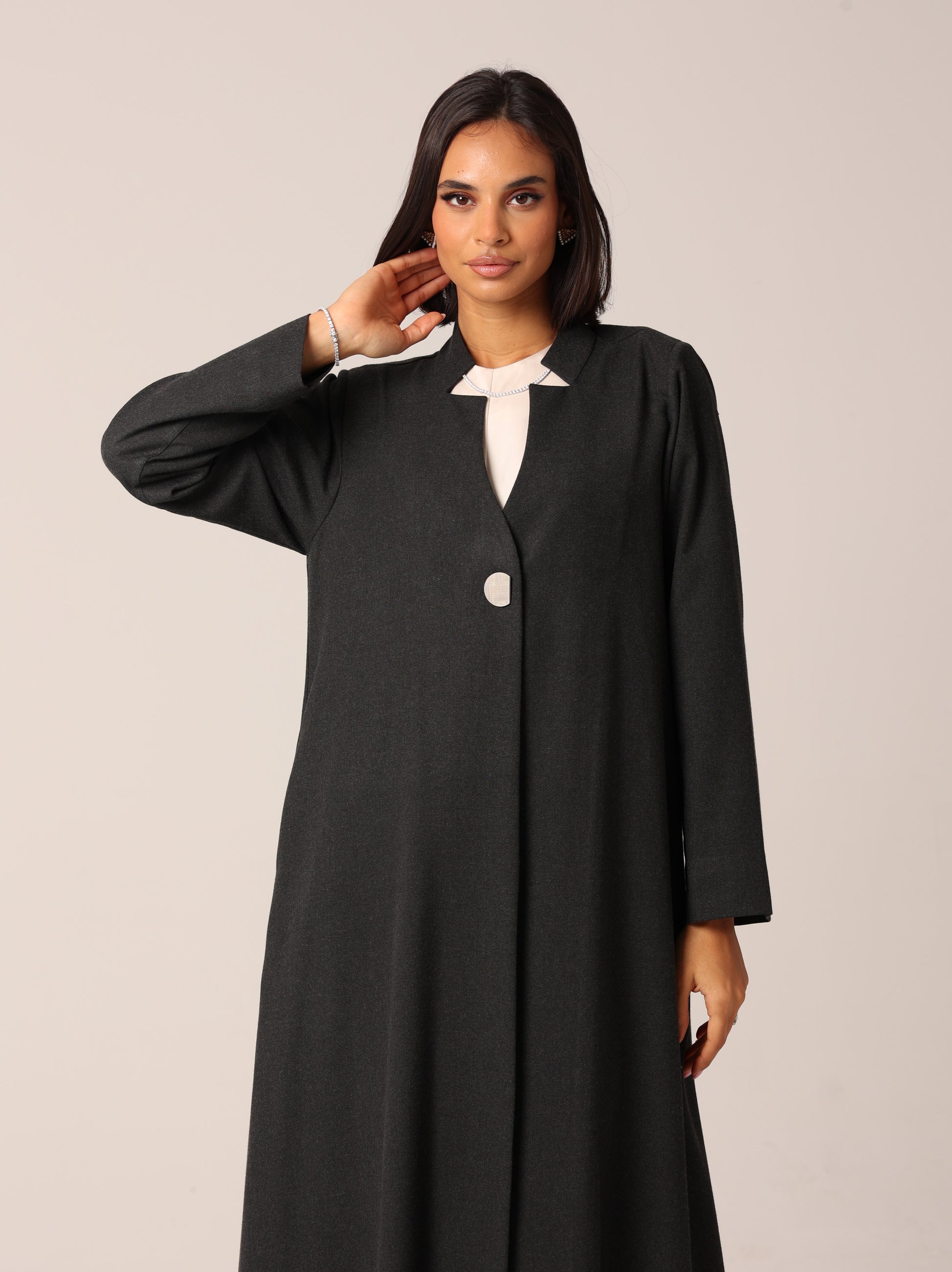 This abaya is crafted from the finest, Felt fabric, exuding a sense of opulence. It features an elegant jacket cut, fastened with a single button for a sophisticated touch."