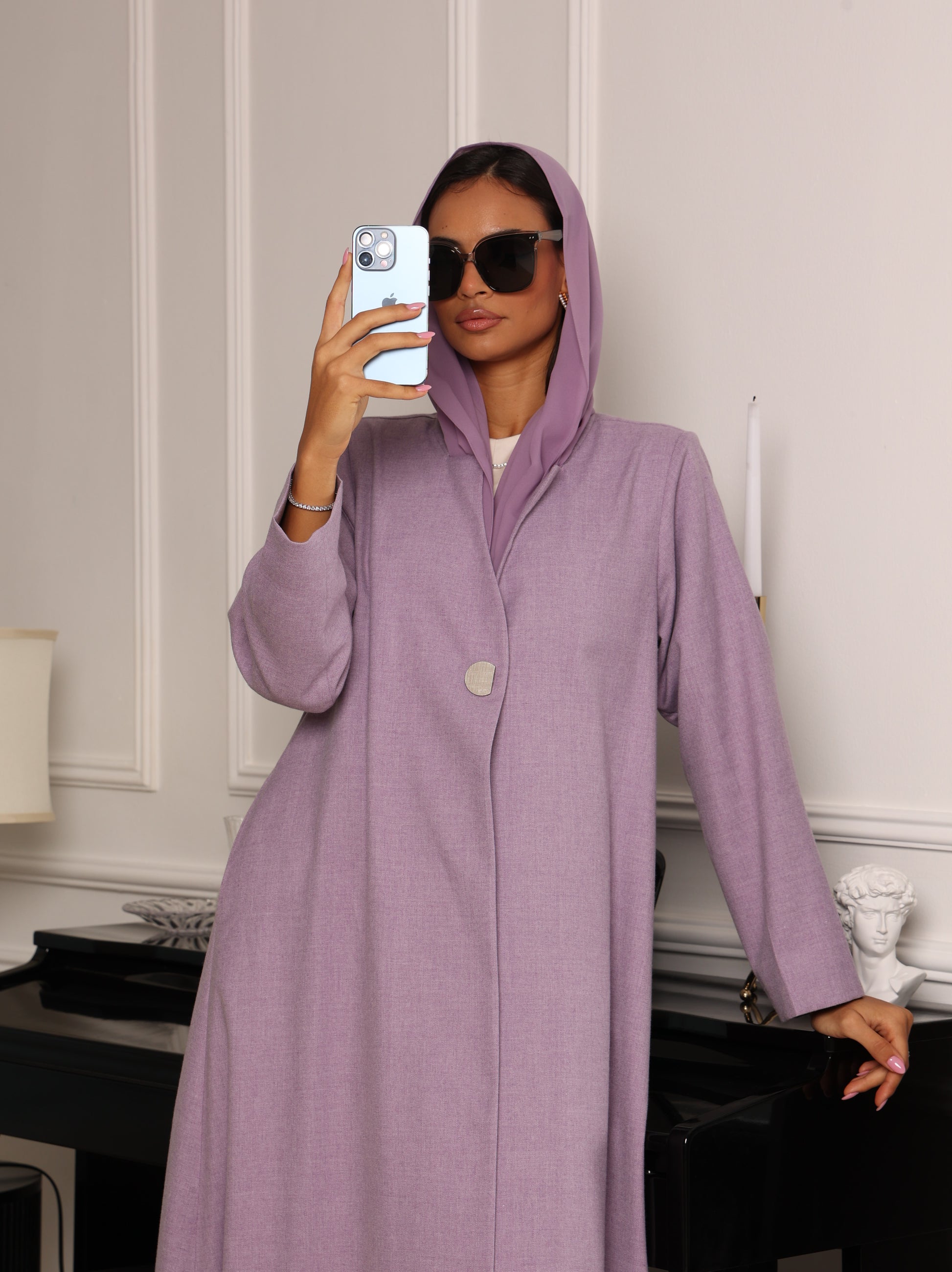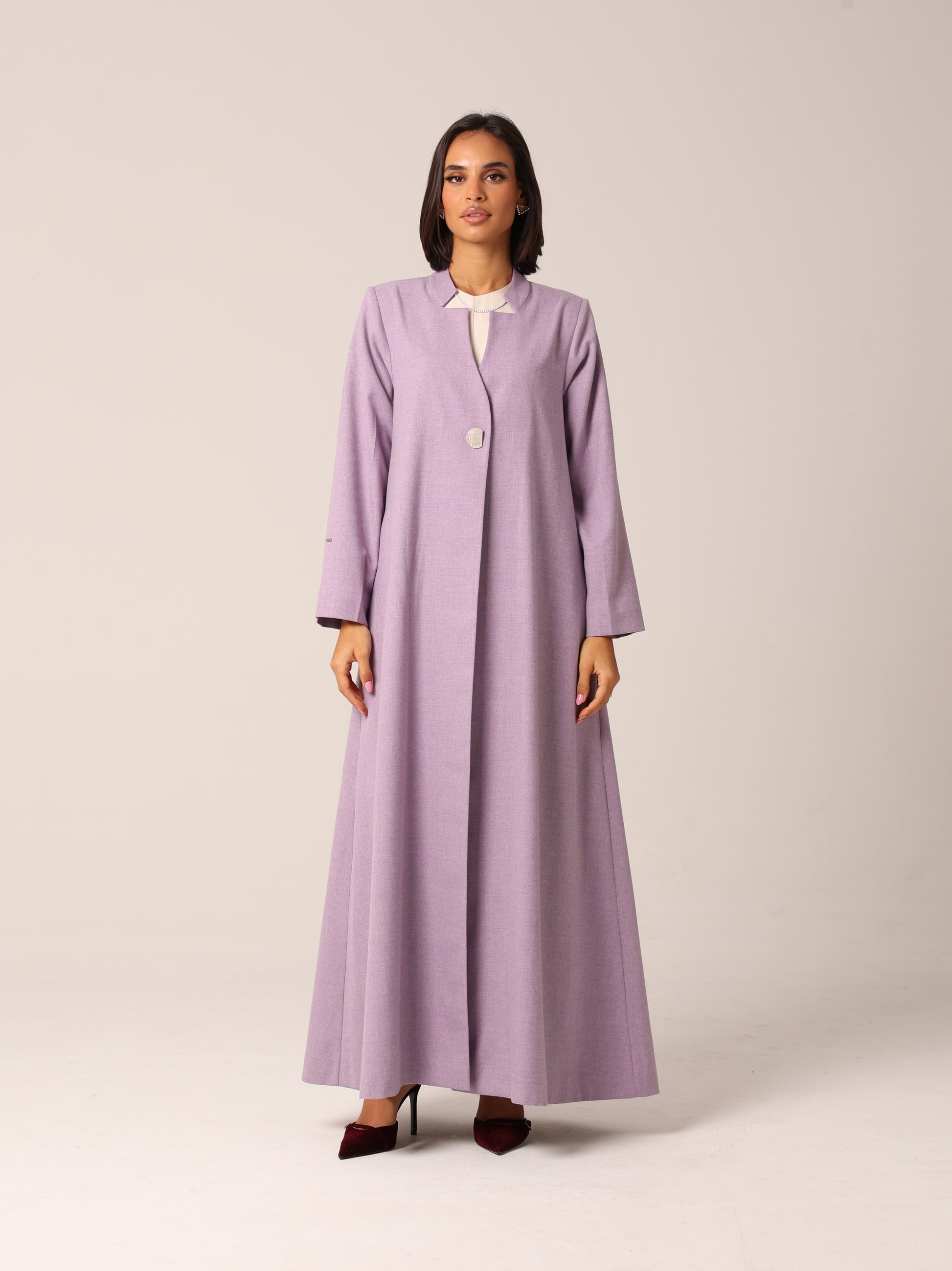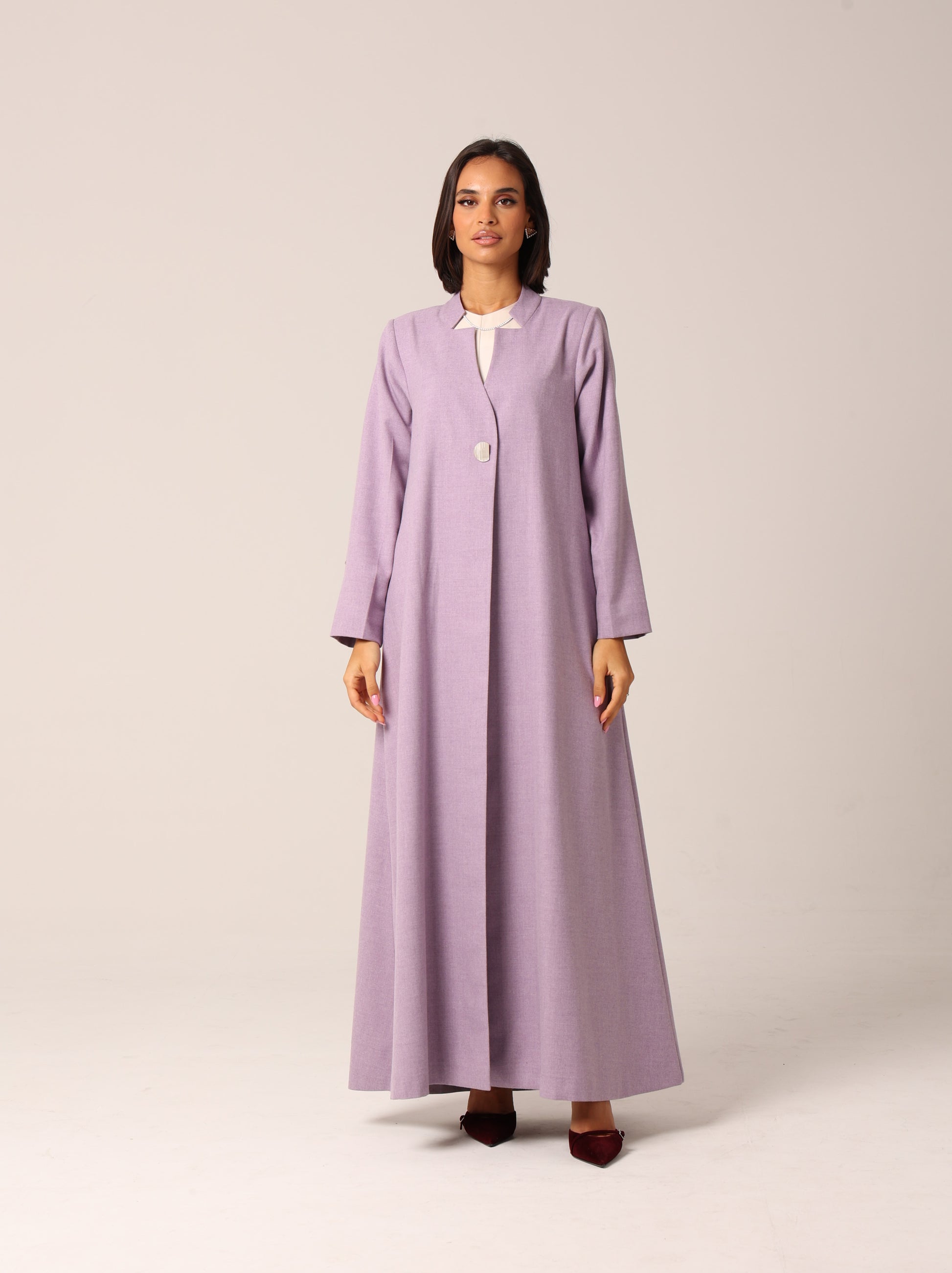 This abaya is crafted from the finest, Felt fabric, exuding a sense of opulence. It features an elegant jacket cut, fastened with a single button for a sophisticated touch."