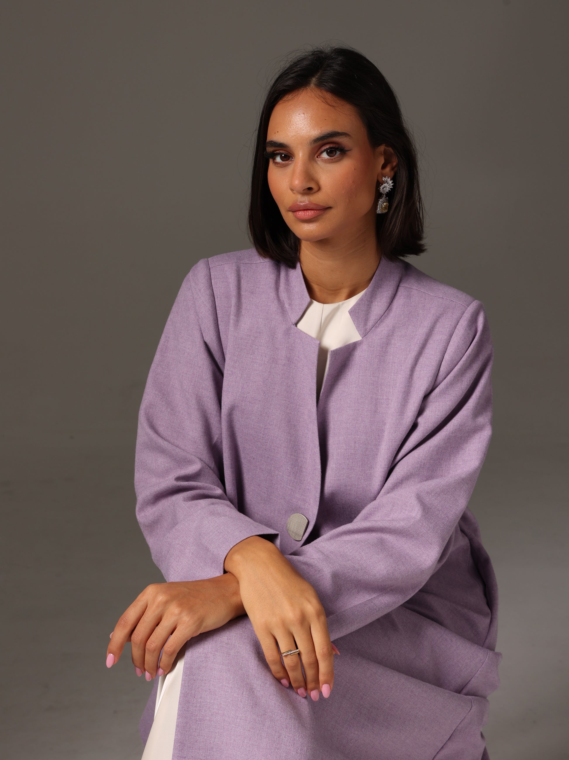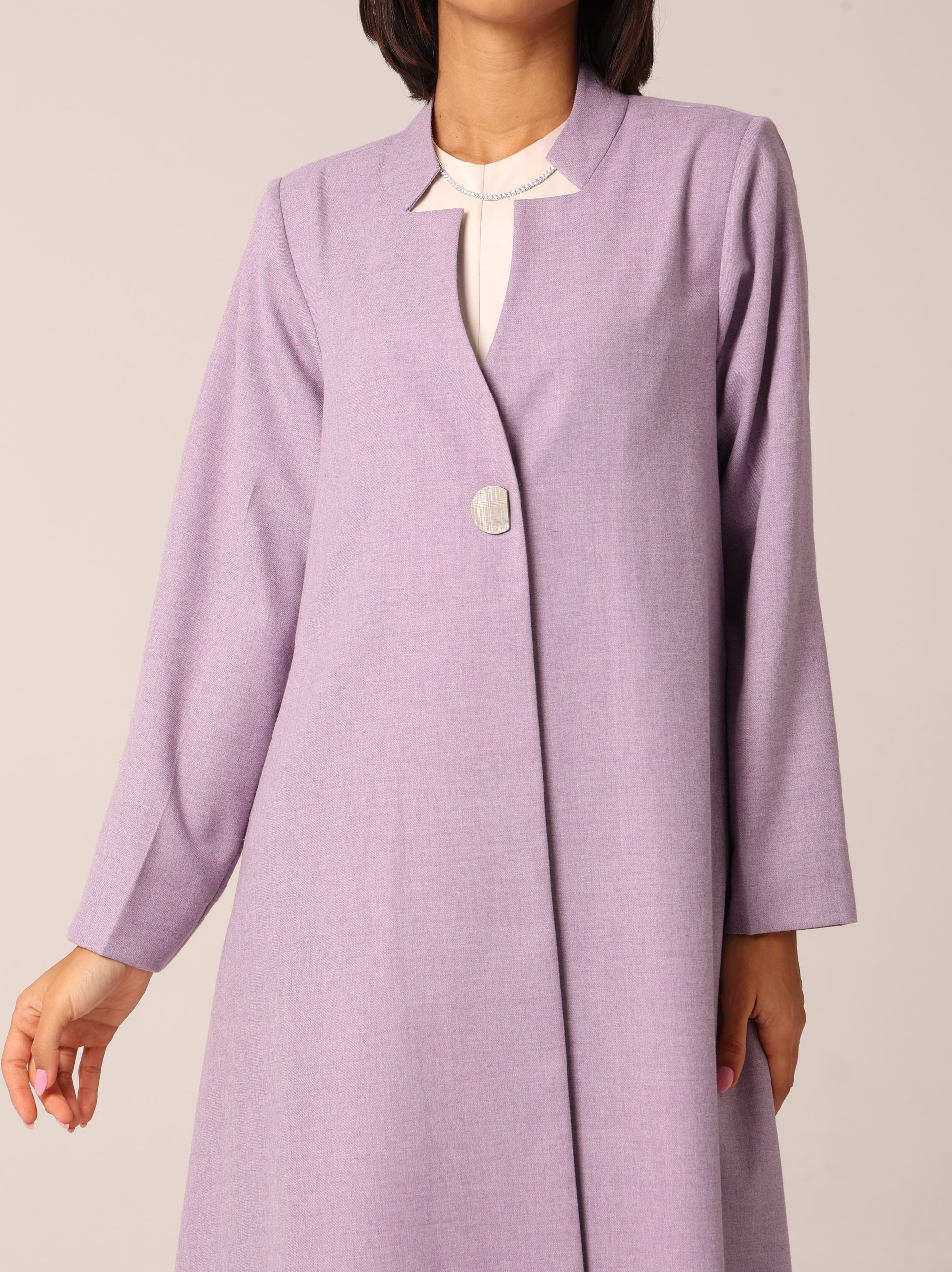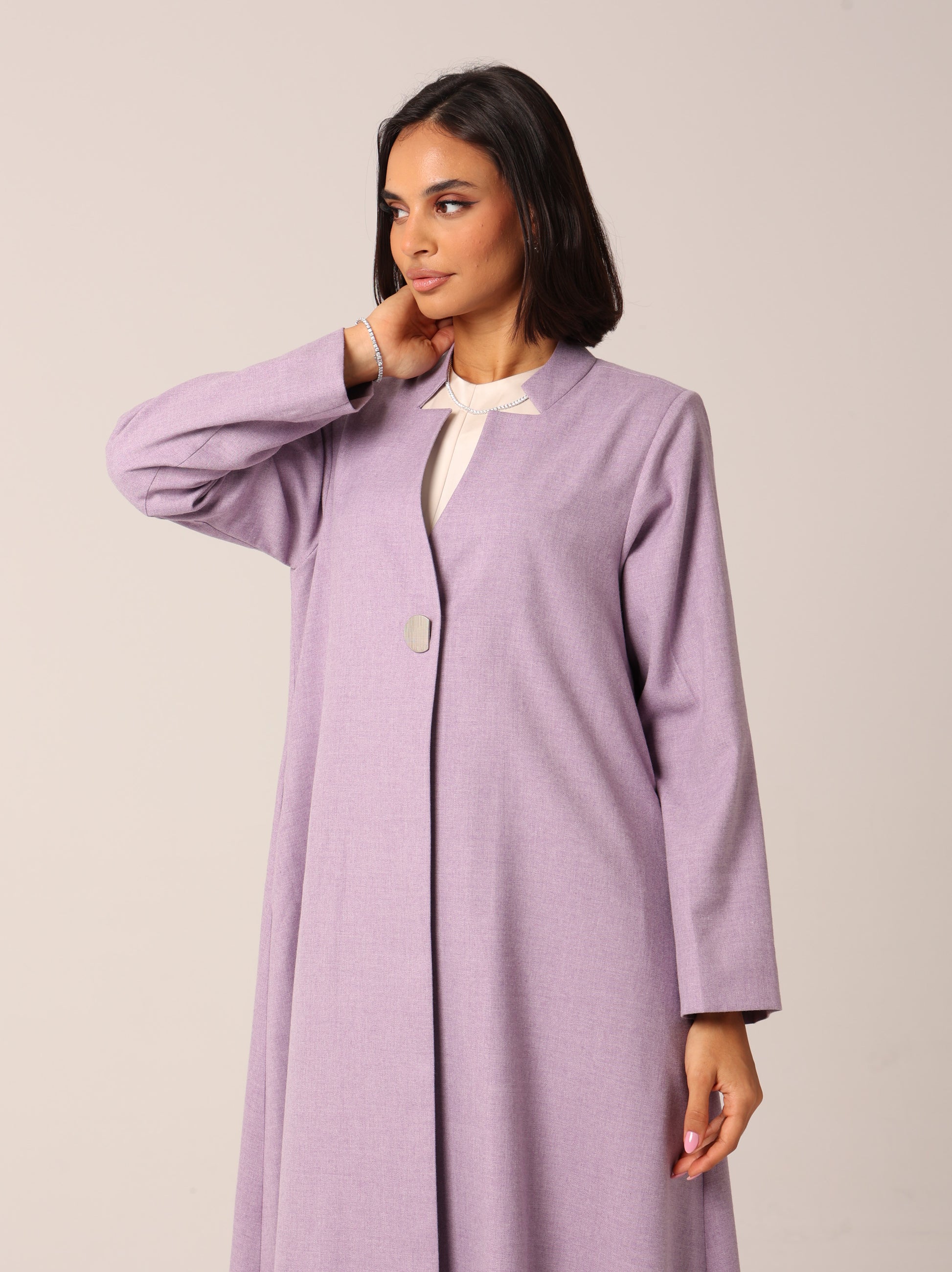 This abaya is crafted from the finest, Felt fabric, exuding a sense of opulence. It features an elegant jacket cut, fastened with a single button for a sophisticated touch."