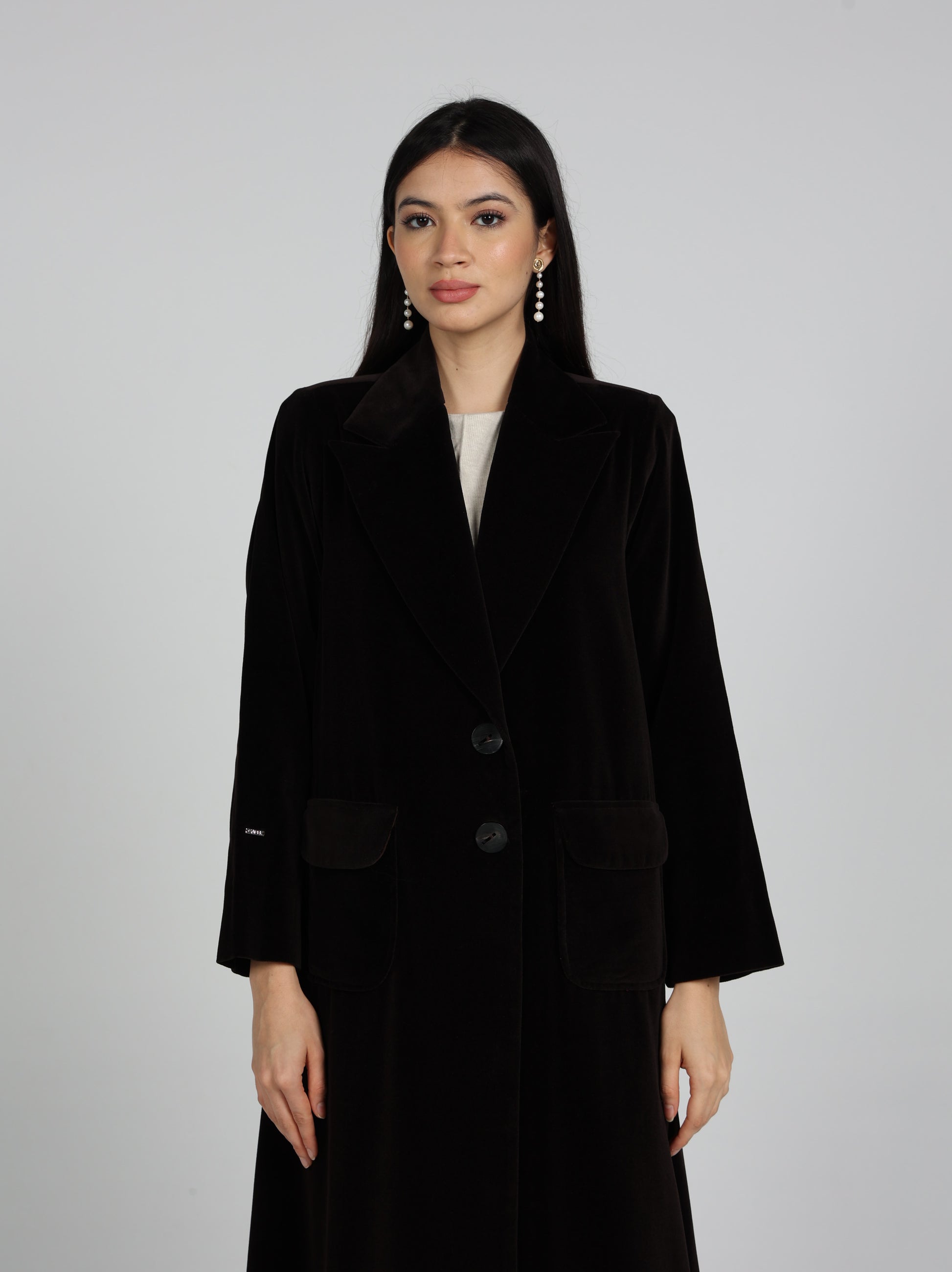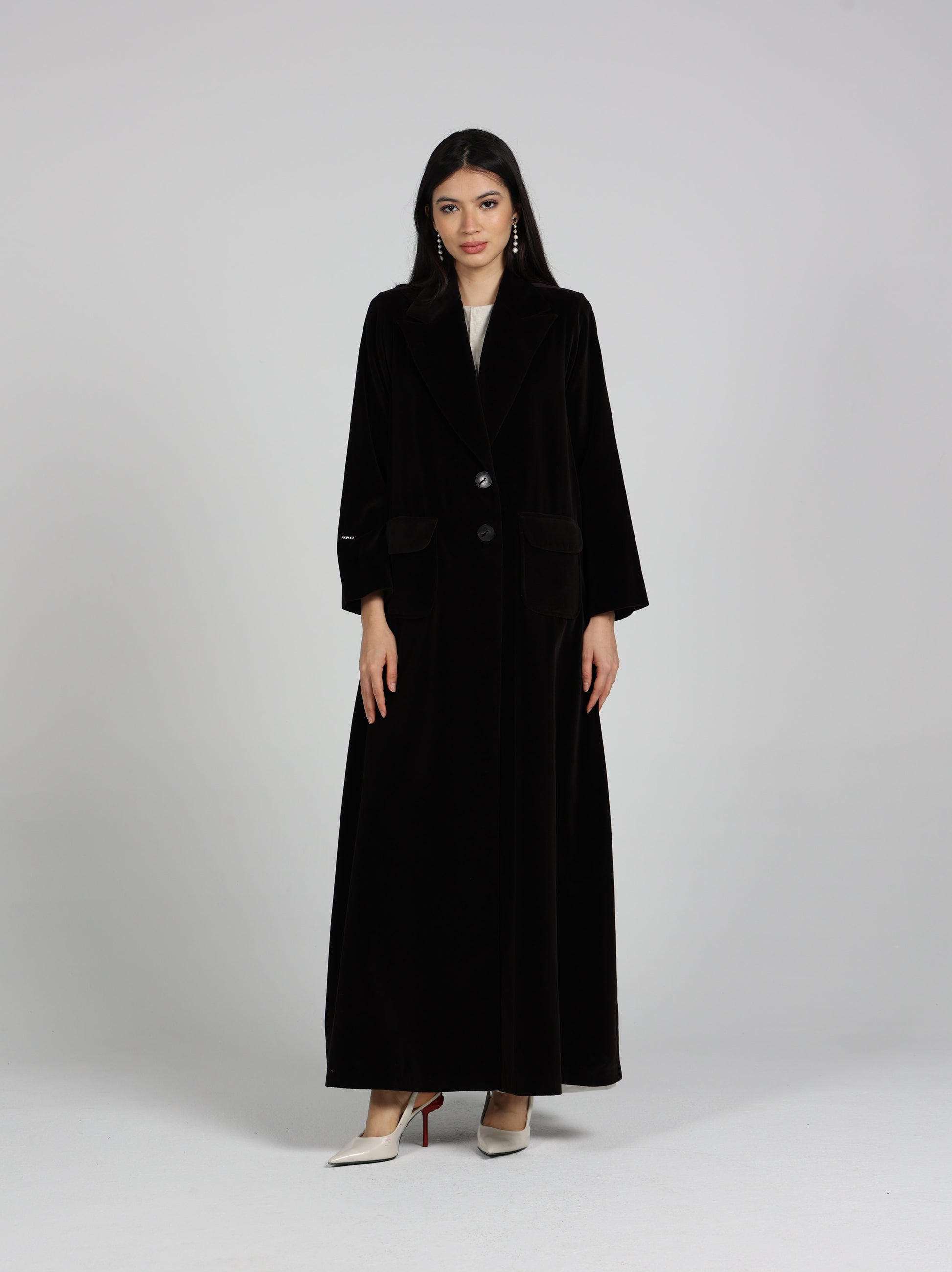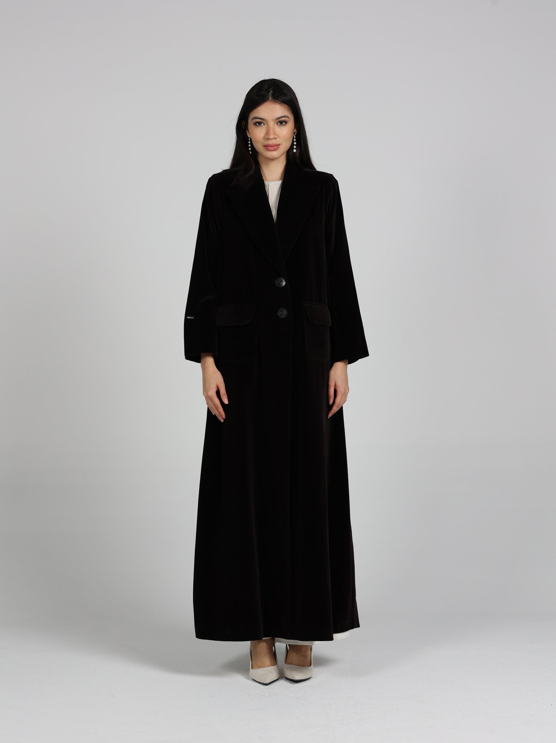 العباية من قماش المخمل الفاخر مصممة بأناقة، مع ياقة جاكيت ، معها شيلة من نفس اللون