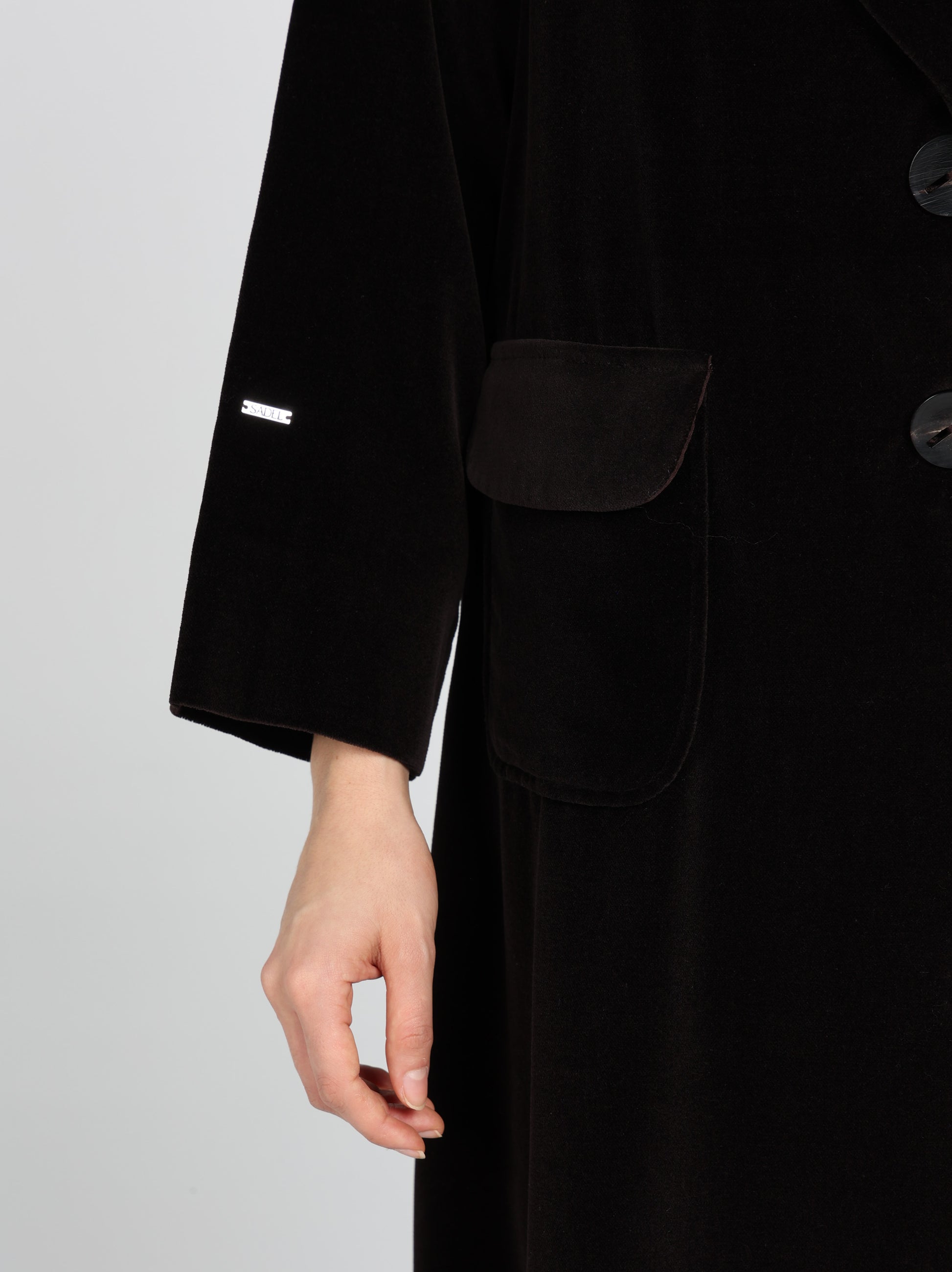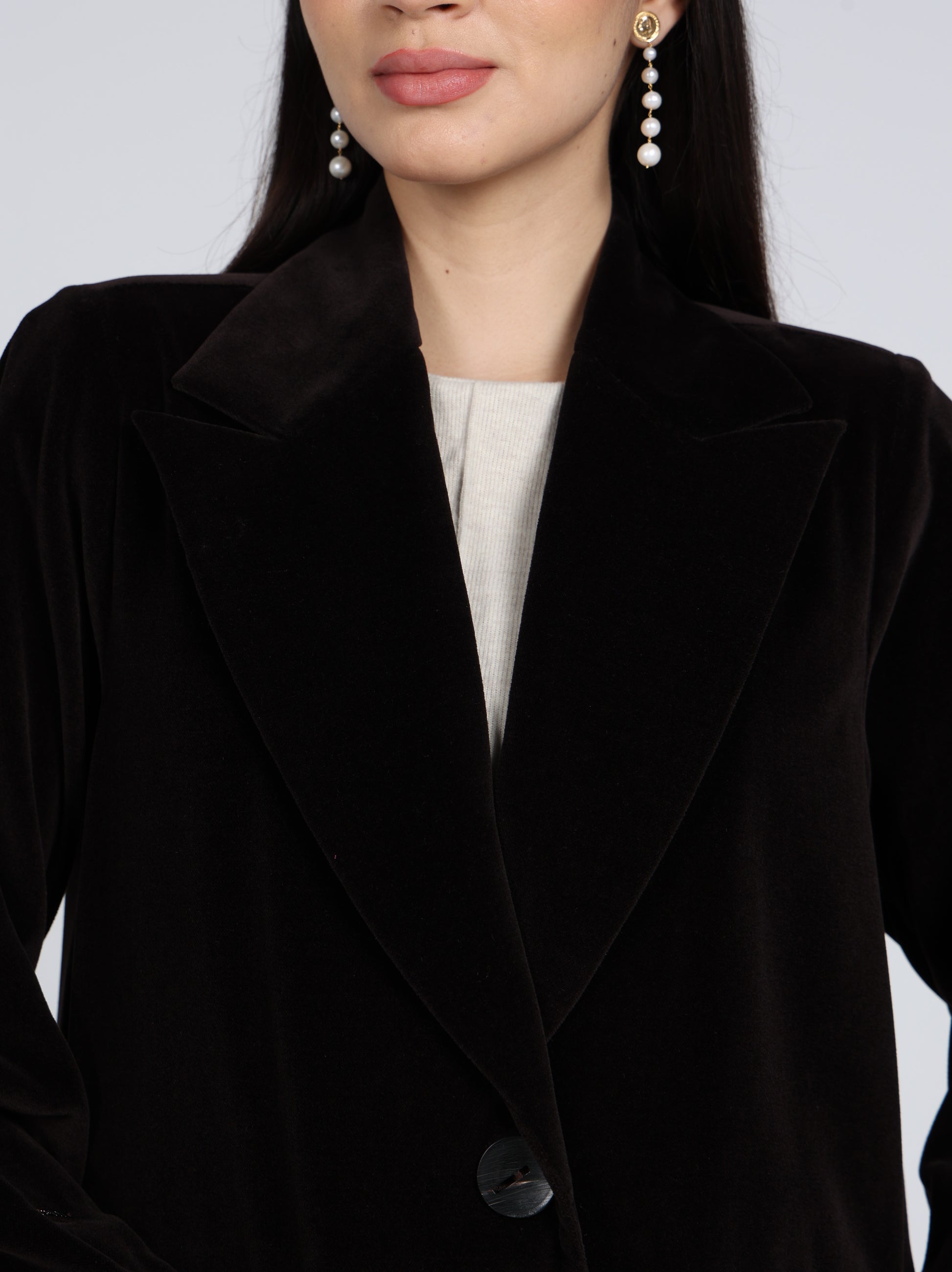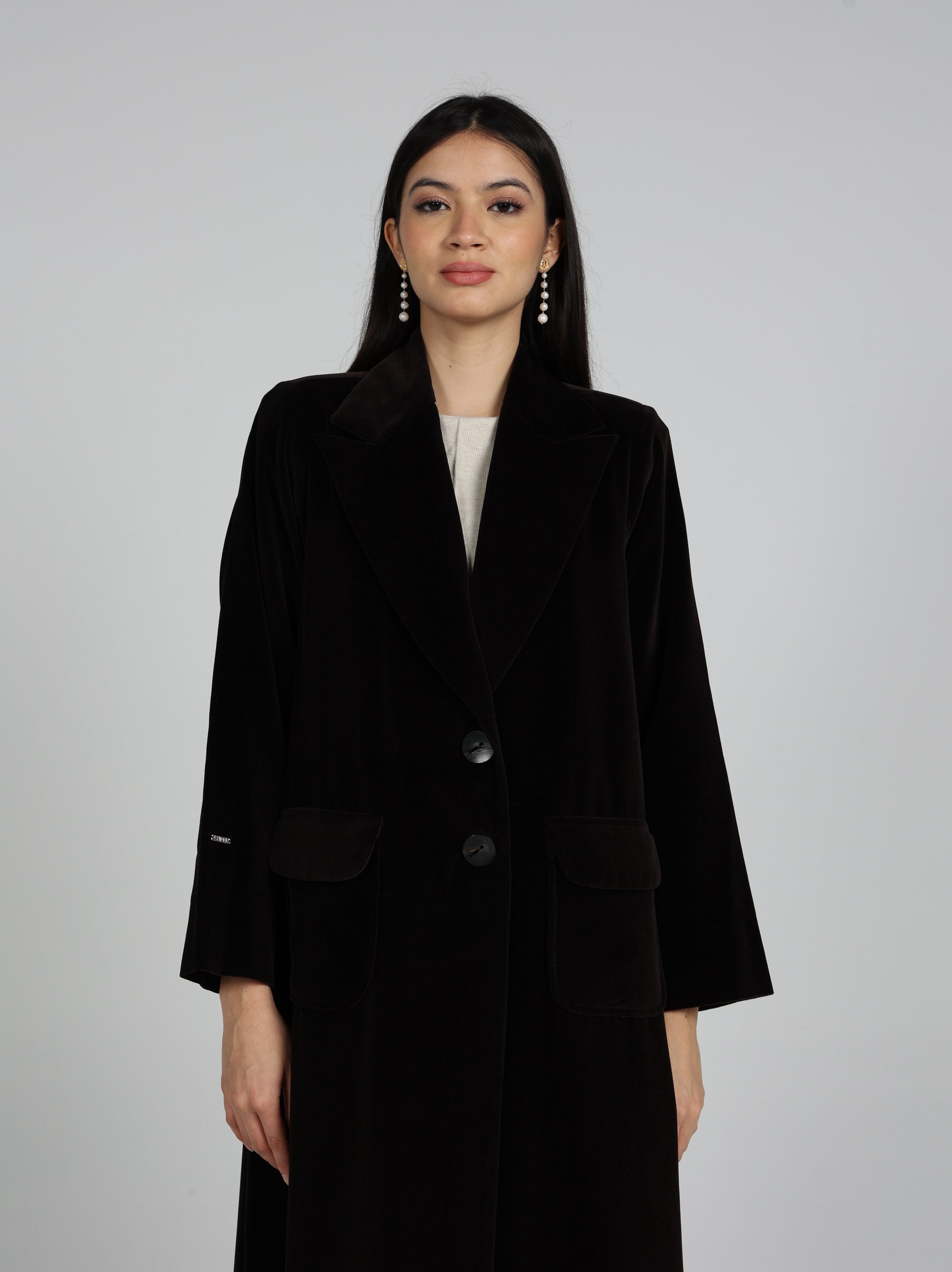 العباية من قماش المخمل الفاخر مصممة بأناقة، مع ياقة جاكيت ، معها شيلة من نفس اللون